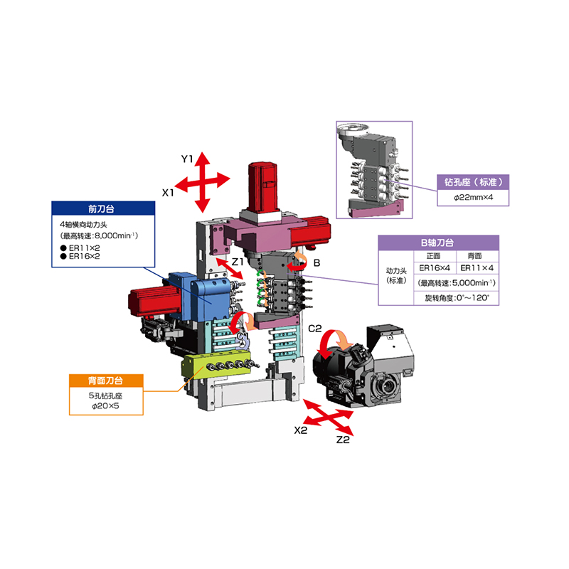 搭載B軸四支動力頭,實(shí)現(xiàn)0-120°旋轉(zhuǎn),滿足超級復(fù)合加工需求